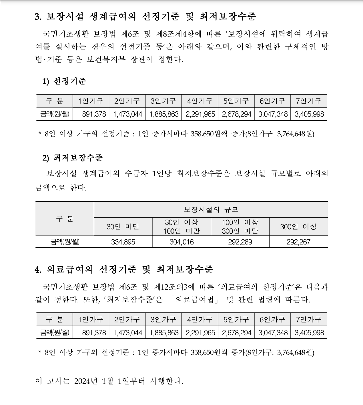 국민기초생활보장법 제6조제2항과 제 2조 제 11호에 의하여 보건복지부 장관은 급여의 기준 등에 활용하기 위하여 중앙생활보장위원회의 심의와 의결을 거쳐 매년 8월 1일까지 다음 연도의 급여별 선정기준 및 최저보장수준을 공표하여야 한다.