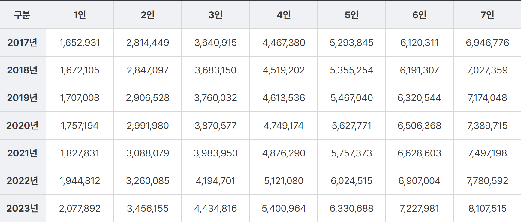 보건복지부에서 2017년부터 2023년까지 발표한 기준중위소득은 다음과 같다.