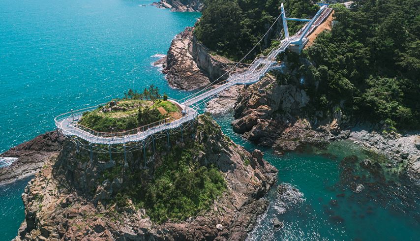 송도 용궁 구름다리는 위에서 보면 행운의 열쇠처럼 보이기도 하는데요, 그래서 행운을 가져다주는 섬으로 불리기도 합니다. 케이블카를 탔어도 꼭 가보시기 바랍니다.